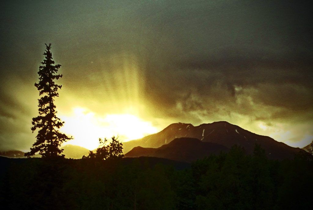 The Midnight Sun has begun to rapidly abandon its nighttime vigil, dipping below the horizon four minutes earlier with passing each day.  This evening, as if in reluctant protest, it exited behind the mountains in a brilliant burst of defiant detonation, an epic portrait of Divine omnipotence!