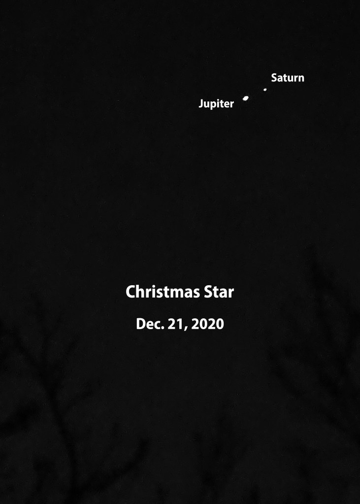 Here’s my novice pic of the ‘Christmas Star’, the Great Conjunction of Jupiter and Saturn which adorned last night’s sky. The last time Jupiter and Saturn were this close together was in 1226 A.D when Genghis Khan was busy conquering Asia. Don’t despair if you missed it, just mark its repeat performance as a ‘Must See’ on your 2080 calendar . . . I’ll be watching from Upstairs 😊.