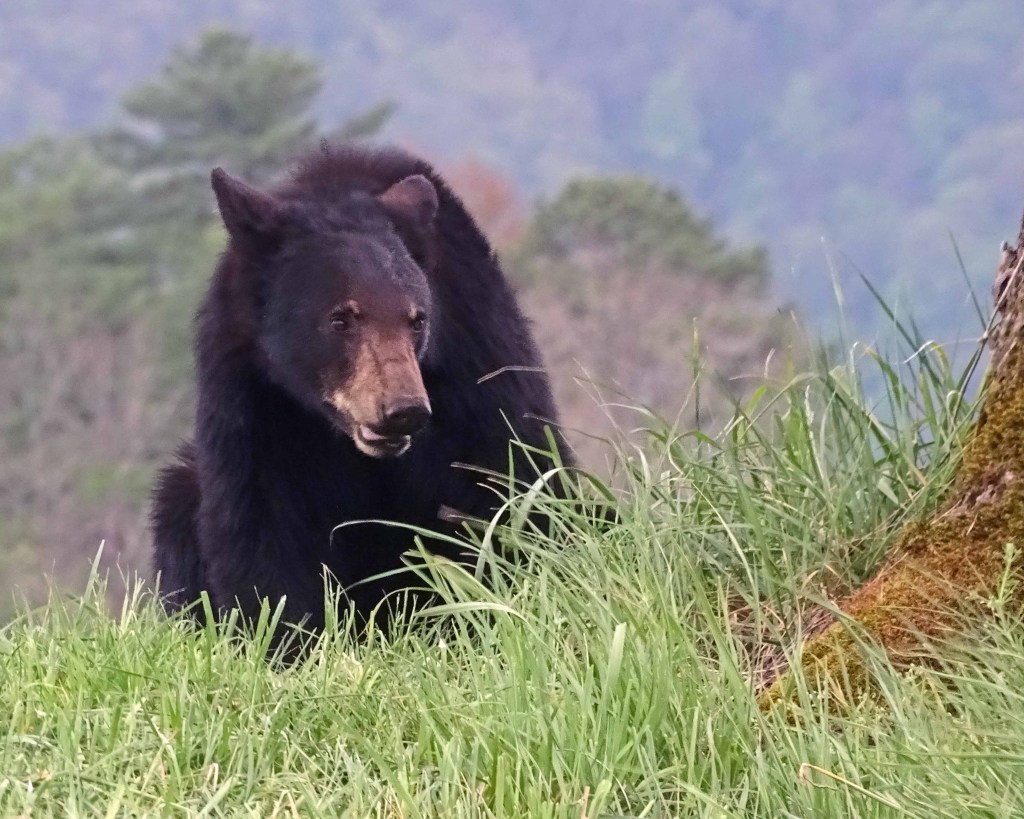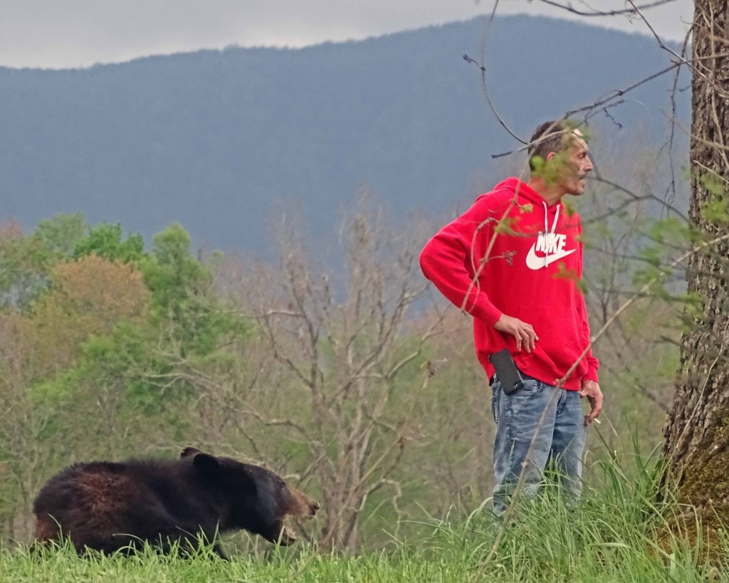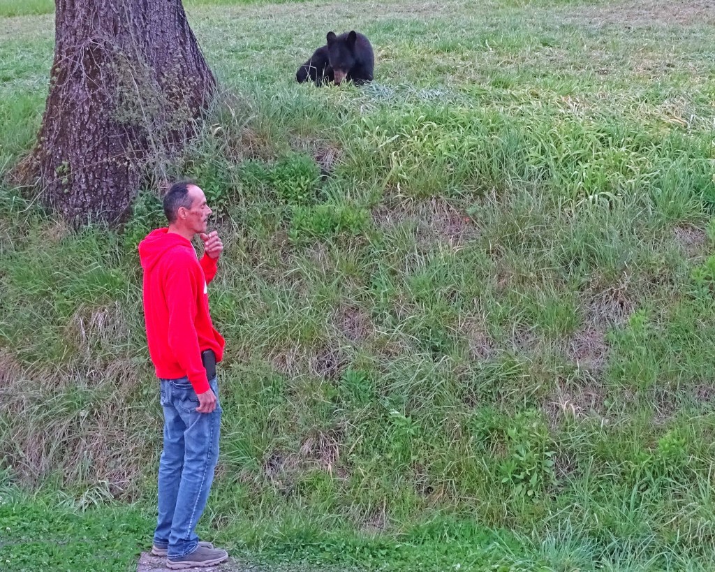 I’m doubt this dude was the class Valedictorian.  When I suggested he consider backing off he replied, “I bet I could pet it”. Fortunately, this yearling bear preferred to continue munching on walnuts rather than dine on Tourist T-Bone 😊