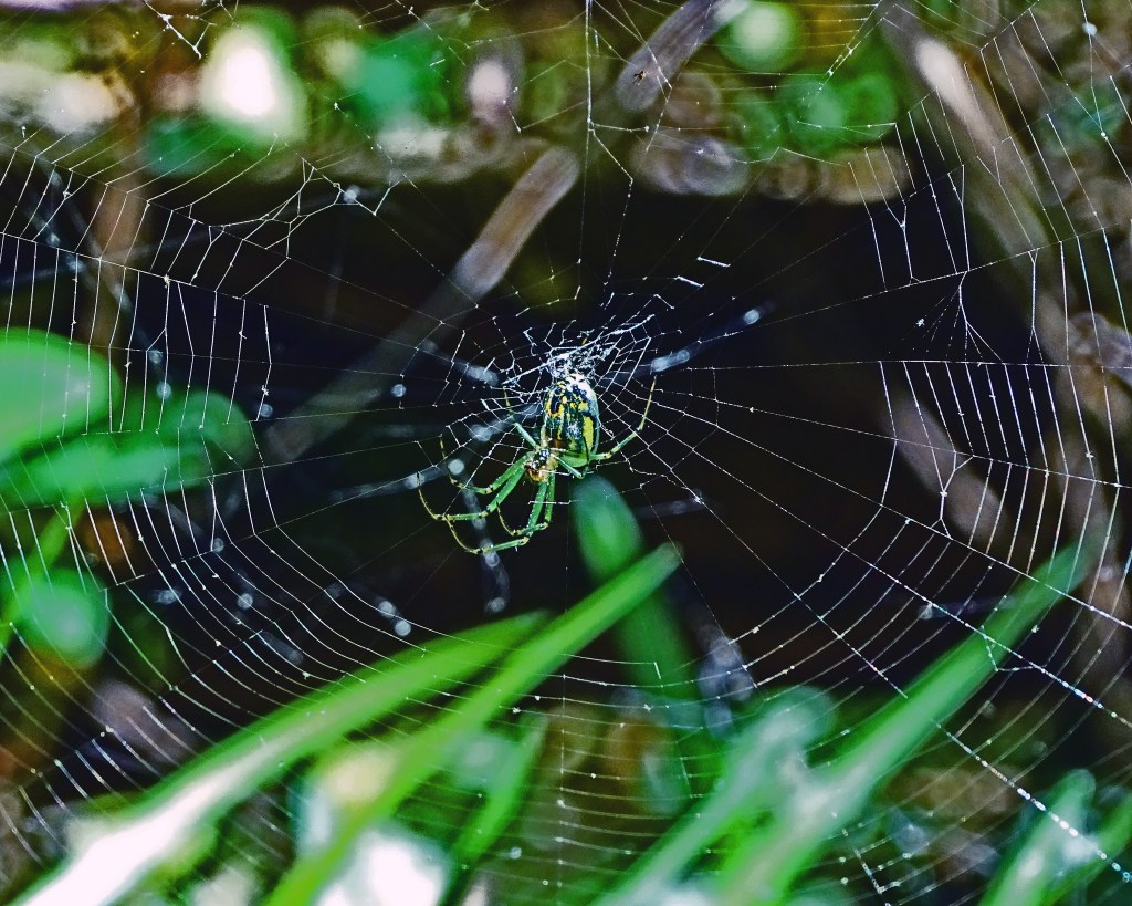 With no blueprint to follow, I watched fascinated as the tiny spider arduously spun its exquisite, geometric web . . . a web of beauty to me . . . a web of death to an unsuspecting insect.
