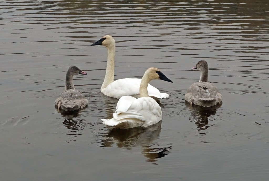Flight School needs to start soon if these cygnets are going to accompany their parents south before freeze-up. This young Trumpeter swan pair hatched their cygnets the end of June , much later than previous Trumpeter parents . . . Frosty Eagle’s watching.