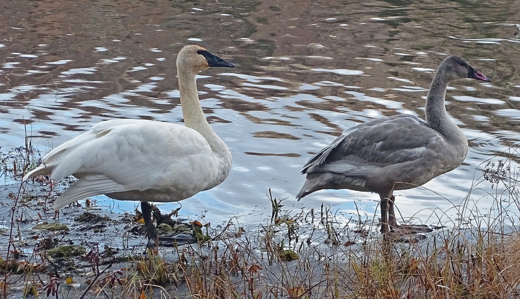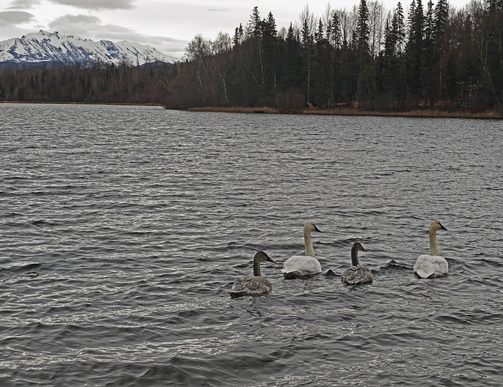 Mother Nature has granted our Trumpeter family a Flight School extension. The temps have warmed into the 40s and melted much of the ice that had began to form on the lake. The larger of our two local cygnets was able to get airborne for a short distance with their parents yesterday before splashing back down in somewhat less than graceful fashion. The smaller cygnet was unable to achieve lift-off and paddled madly behind across the lake squawking “Wait Up! Wait Up!” 😊. Here’s a few pics of our ‘Trumps’.