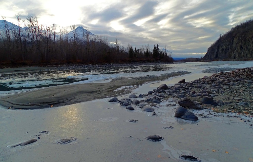 Today’s wilderness wander found me hiking the Matanuska River Valley. Carving its path over millennia between snow-laden peaks of the Chugach and Talkeetna Ranges, it’s birthed 25 miles upstream in the Matanuska Glacier.