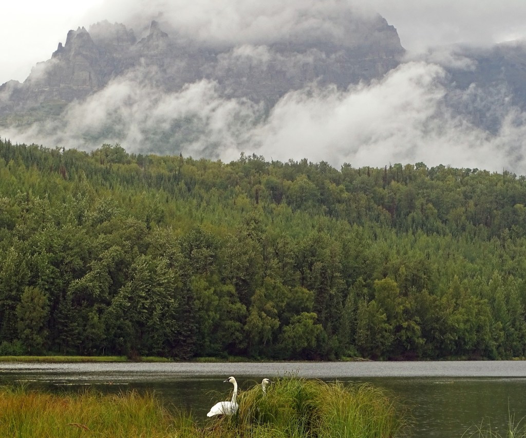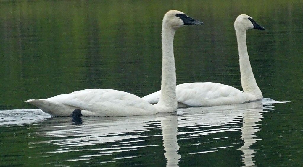 A pair of trumpeter swans, a grebe, and a loon were my drizzling mist companions on a tranquil canoe paddle on the lake this afternoon . . . a relaxing backyard trek well worth to getting wet for 😊