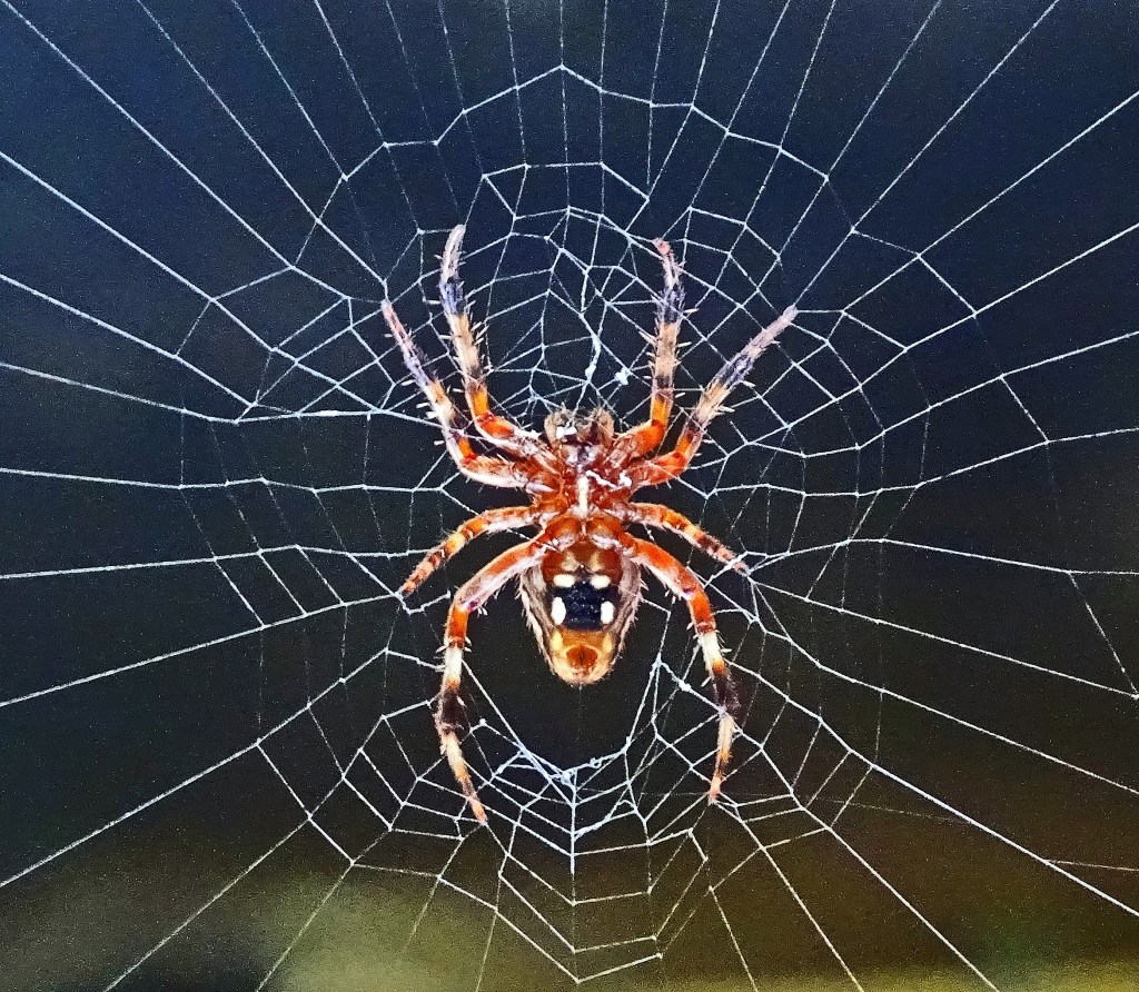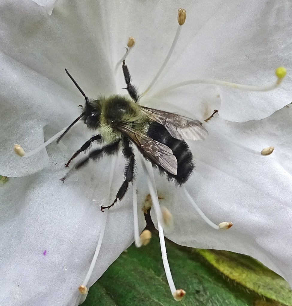Finally getting upright, I poured myself a steaming cup of java and ventured outside for a short streamside stroll. A poem by Cecil Frances Alexander’s came to mind as Nature displayed two of Creation’s small wonders to me . . . a bumble bee pollinating an azalea bloom, and a garden spider on patiently waiting its web (perhaps for the bumblebee 😊)